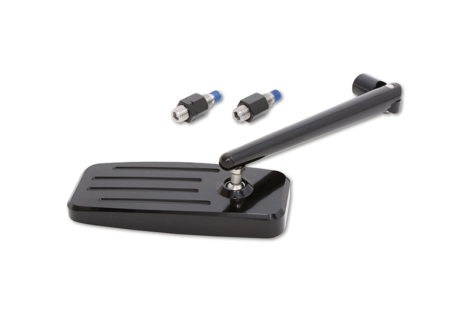 oder schwarz wählbar Hochwertig verarbeiteter, CNC-gefräster Spiegel in rechteckiger Form, verchromter Kopf aus Aluminium, mit verstellbarem Stiel. Dank der Verwendung eines zweiten Gelenks am Stiel ergeben sich zusätzliche Einstellmöglichkeiten für Ihre Sicherheit. Inklusive extra Adapter M10 x 1,25 mm mit Linksgewinde für Yamaha. Für linke und rechte Seite verwendbar.