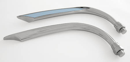 Diese Modell setzt ein Ausrufezeichen bei Custom Bikes. In das hochglänzend, verchromte Aluminiumgehäuse ist kontrastreich ein blaues Glas eingesetzt. Die stark gebogene Form sowie der nahtlose Übergang von Spiegelarm und -Kopf unterstreichen das extravagante Design.