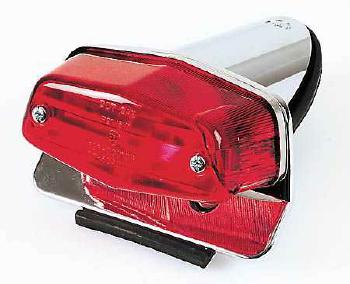 Rücklicht mit Bremslichtfunktion, Nummernschildbeleuchtung in verchromtem Metallgehäuse und Nummernschildhalter. Maße Breite unten ca. 95mm, oben ca. 85mm, Höhe ca. 40mm, Gesamttiefe mit Gehäuse ca. 145mm. E-geprüft.
