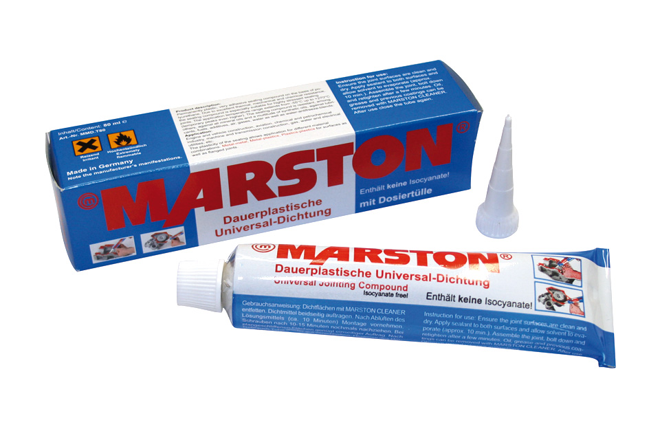 Die Dichtflächen mit MARSTON CLEANER reinigen. MARSTON - Universaldichtung einseitig auftragen, bei starken Rautiefen beidseitig und ca. 10 Minuten ablüften lassen. Danach Teile montieren. Nach 10 Minuten nochmals die Schraubverbindung nachziehen. Keine längere Wartezeit erforderlich!