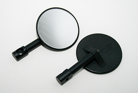 Lenkerendenspiegel, schwarz, Paar. Glas ist Konvex. Es muss eine ca. 10 mm längere Schraube benutzt werden um den Spiegel an die vorhandenen Lenkergewichte anzuschrauben.