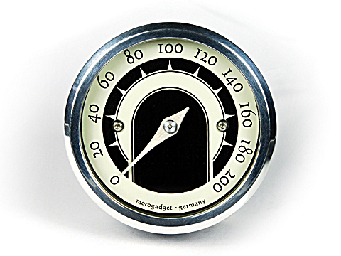 Technisch ist das Instrument mit dem motoscope tiny identisch. Das Ziffernblatt ist an das Streamline-Design der Vierziger und Fünfiger Jahre angelehnt. Passend dazu ist es in einem wärmeren Weiss gehalten. Der Zeiger ist in seiner Form auf das Ziffernblatt abgestimmt und aus gebürstetem Edelstahl gefertigt und der Schraubring ist auch hier poliert oder schwarz eloxiert erhältlich.