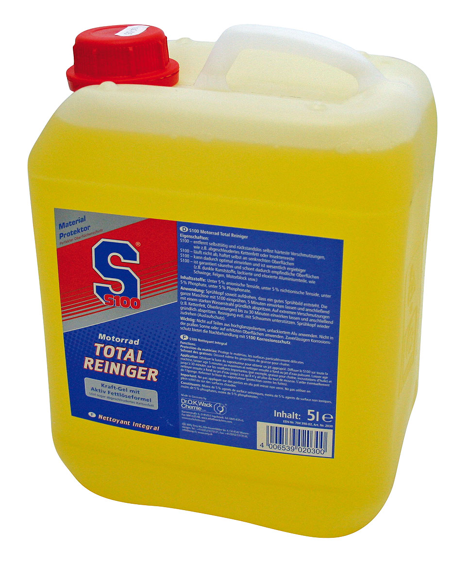 Das gesamte Motorrad mit S100 Total Reiniger+ einsprühen. Die Gelformel je nach Verschmutzungsgrad 5 bis max. 30 min einwirken lassen. Bei Bedarf Reinigung mit einem Schwamm unterstützen. Anschließend das Motorrad mit einem starken Wasserstrahl gründlich abspritzen und lufttrocknen lassen oder abledern. Das Motorrad trocknet auch ohne Abledern selbständig wasserleckenfrei. An waagrechten Stellen, wo das Wasser nicht abließen kann, nachtrocknen.