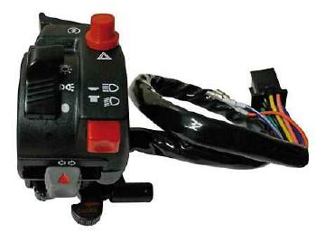 Uni-Lenkerschalter Honda mit Chokehebel, für ATV + MRD, links, Funktionen: Licht an/Standl./aus, auf/ab, Blinker, Kill, Horn, Warnblinkschalter mit Gummitülle. Wie #240-008, jedoch mit Chokehebel. Breite: 45 mm. Für den Starter sind zwei Kabel herausgeführt. Somit ist der Schalter für Plus- oder Masse geschaltete Anlasser geeignet. Der Artikel verfügt über einen Starterknopf, aber NICHT über einen Killschalter.