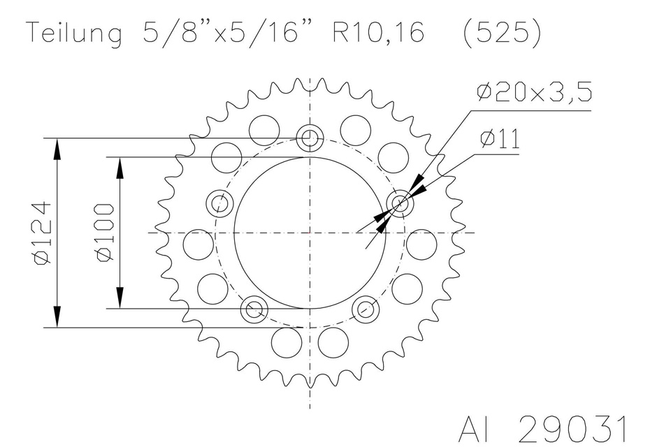 Alu-Kettenrad 38 Zähne Alu 525er Teilung (5/8x5/16)