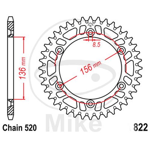 Alu-Kettenrad: 52Z, Teil.: 520 silber, JT, Innen Ø : 136, Lochkr.: 156