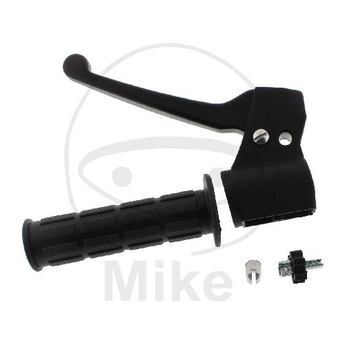 Hebelarmatur links von Tomaselli mit schwarzem Griffgummi für Seilzug. Mit schwarzem Kunststoffhebel und passendem Nippel sowie Stellschraube. Hebellänge 135mm. Gehäuseform am Lenker: rechteckig.