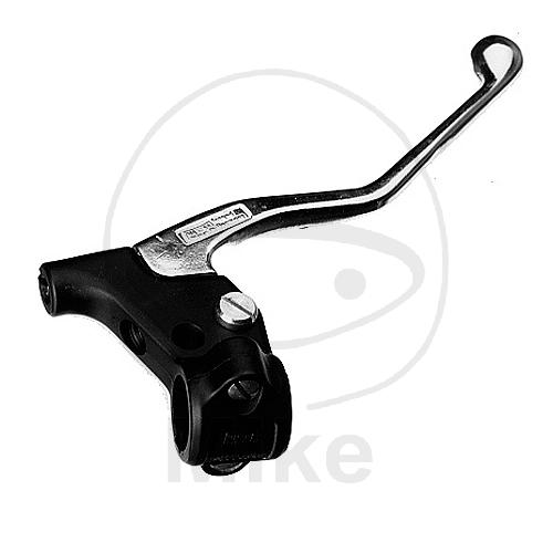 Sport-Bremshebel für mechanische Bremsen (Trommelbremsen), Gelenkstck aus schwarzem Leichtmetall, Schelle geteilt mit zwei Schrauben, Handhebel aus geschmiedetem Leichtmetall im Eurostil poliert, 160 mm lang, Bohrung für Spiegelbefestigung 8,2 mm.