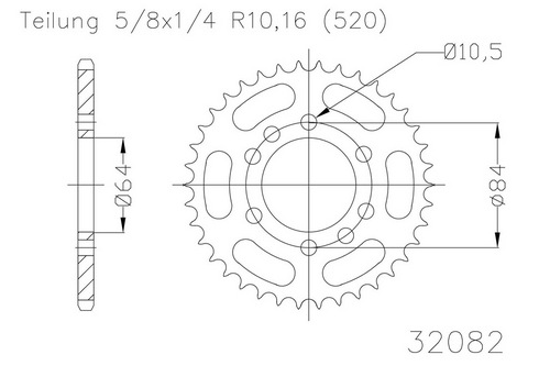 Kettenrad 32 Zähne Stahl 520er Teilung (5/8x1/4)