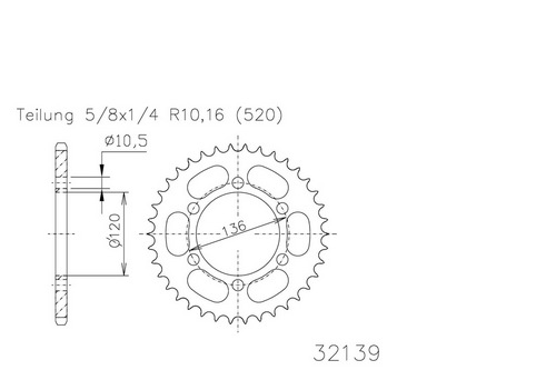 Kettenrad 36 Zähne Stahl 520er Teilung (5/8x1/4)