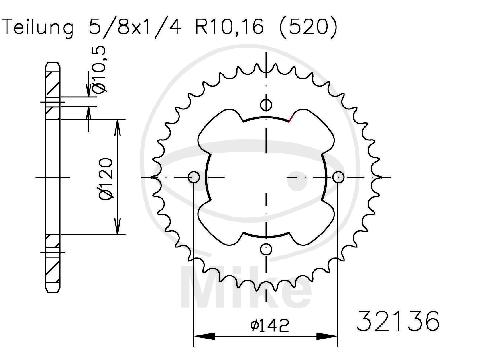 Kettenrad, 38Z, Teil.: 520 schwarz, Innen Ø : 120, Lochkr.: 142