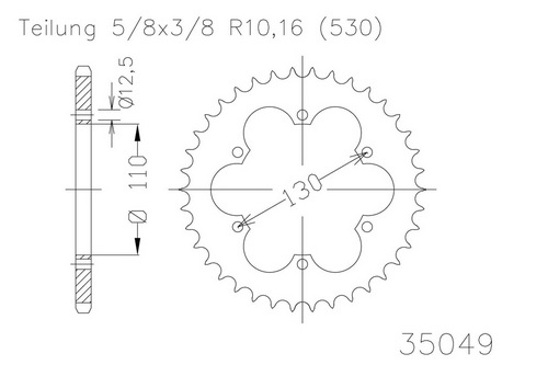 Kettenrad 40 Zähne Stahl 530er Teilung (5/8x3/8)