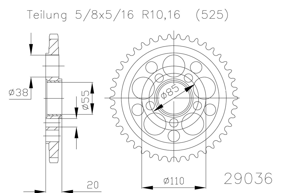 Kettenrad 43 Zähne Stahl 525er Teilung (5/8x5/16)