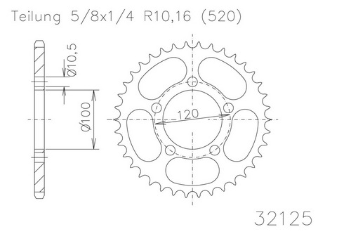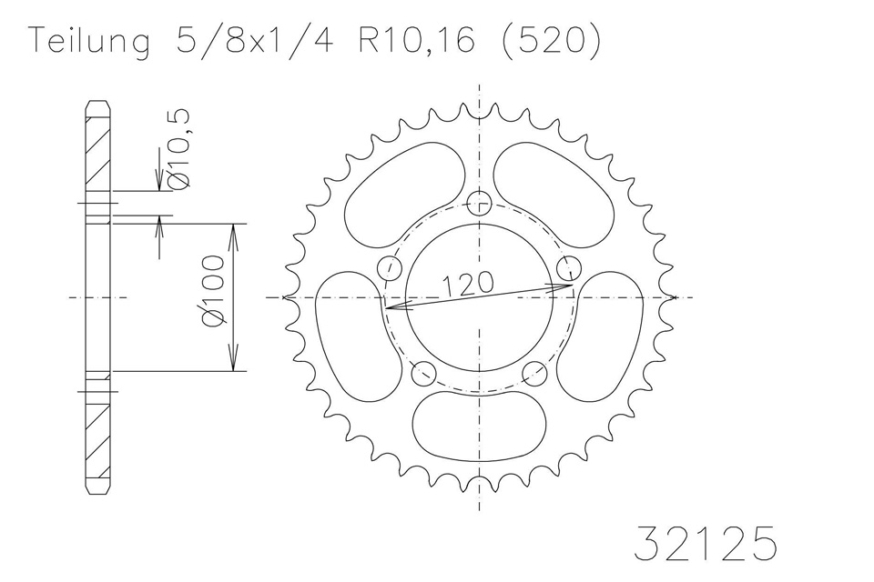 Kettenrad 44 Zähne Stahl 520er Teilung (5/8x1/4)