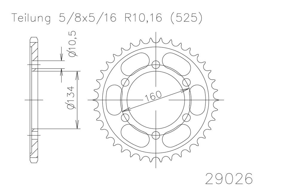 Kettenrad 45 Zähne Stahl 525er Teilung (5/8x5/16)