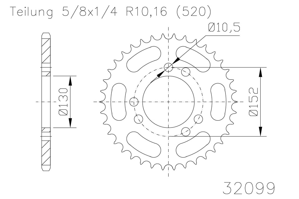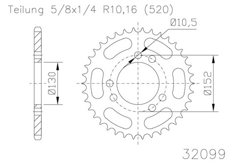 Kettenrad 45 Zähne Stahl 520er Teilung (5/8x1/4)