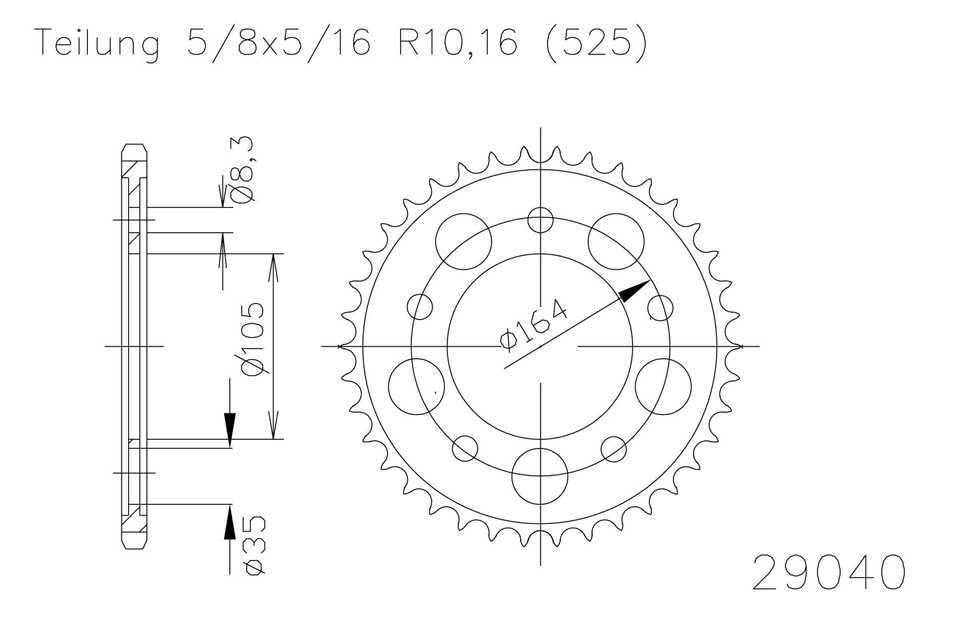 Kettenrad 47 Zähne Stahl 525er Teilung (5/8x5/16)