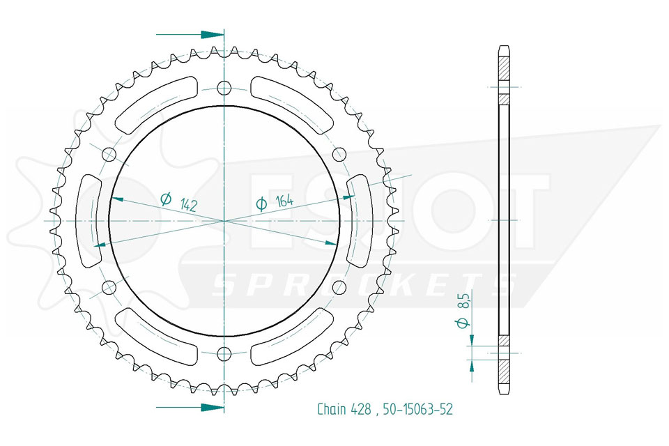 Kettenrad 52 Zähne Stahl 428er Teilung (1/2x5/16)