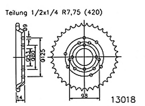 Kettenrad 53 Zähne Stahl 420er Teilung (1/2x1/4)