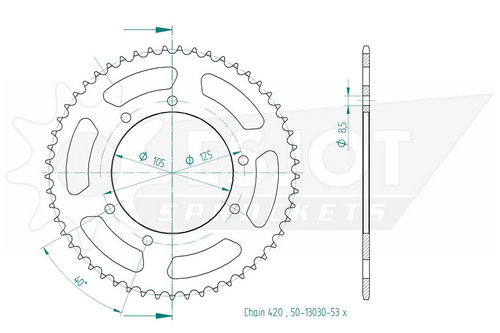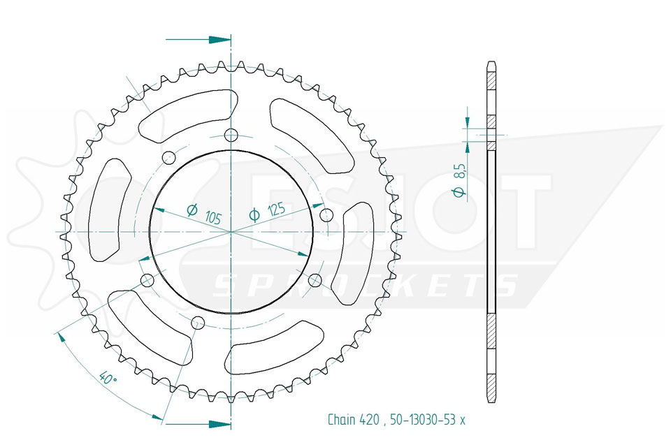Kettenrad 53 Zähne Stahl 420er Teilung (1/2x1/4)