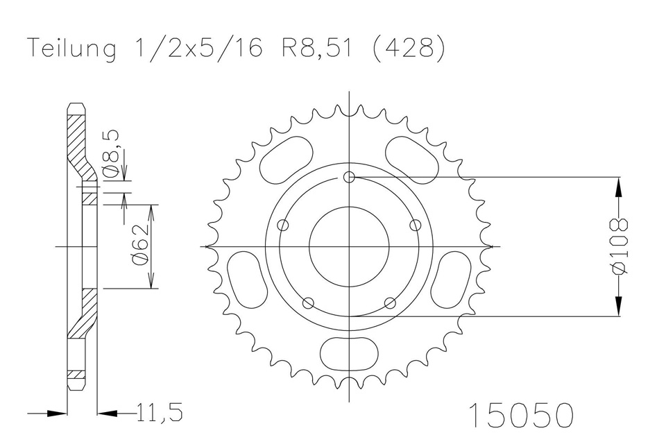 Kettenrad 55 Zähne Stahl 428er Teilung (1/2x5/16)