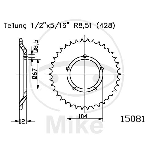 Kettenrad, 55Z, Teil.: 428, Innen Ø : 067, Lochkr.: 104