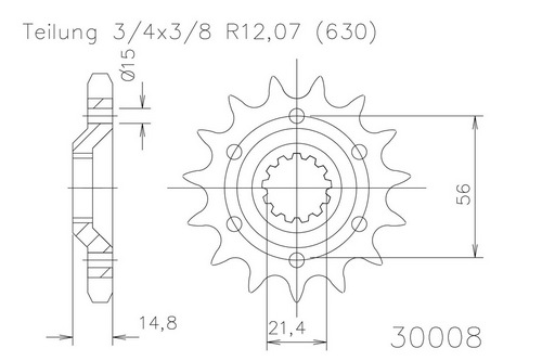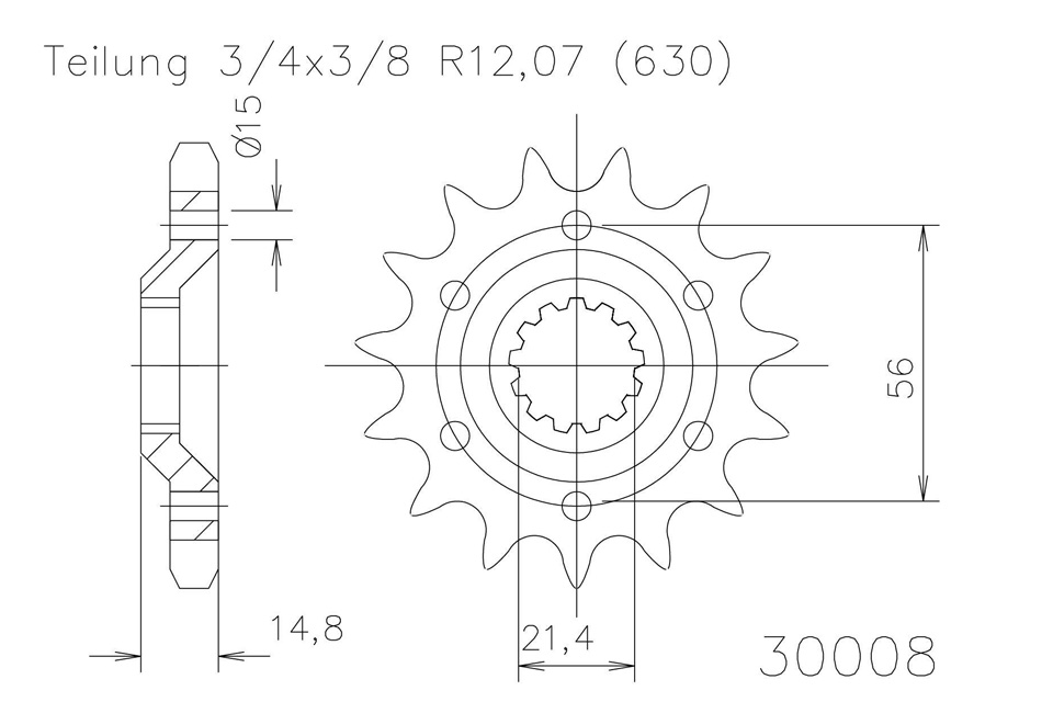 Ritzel 15 Zähne Stahl 630 Teilung (3/4x3/8)
