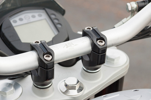 Für die Verwendung von X-Bar-Lenkern (28,6 mm) bietet LSL die erforderlichen Klemmböcke zur Verschraubung in den original Befestigungspunkten der oberen Gabelbrücken an. Die Klemmböcke sind aus hochwertigem Aluminium-Vollmaterial CNC-gefräst. Sie ersetzen die Serienklemmböcke um eine andere Höhe und eine bessere Optik zu erzielen. Sie können in den originalen Befestigungspunkten mit mittig sitzenden M10 x 1.25 mm Schrauben montiert werden. Bei Modellen mit Gummilagerung bleibt diese erhalten.