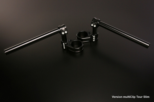ABM multiClip Tour Stummellenker Slim 50/40 mm inkl. Lenkrohre ?22/260 mm<br><br>Die Stummellenker multiClip sogen für eine entspannte Haltung und verbesser den Fahrkomfort. Sie sind individuell anpassbar und bieten eine optimale Feinjustierung.<br><br>Merkmale:<br><br>CNC - gefrästes Aluminium<br>Schwarz harteloxiert<br>Laserskalierung für symmetrische und korrekte Einstellung in allen Positionen<br>Höchste Sicherheit gegen Verdrehen durch Dreifachklemmung an der Gabel<br>Lenkrohr 5° gebogen zur optimalen Feinjustierung des Lenkrohrwinkels<br>Erhältlich für: Klemmhöhe 39 mm // Klemmhöhe 27,5 mm (Slim) // größeres Offset (Wide)<br>Universell verwendbar<br>Auch als Stummellenker KIT verfügbar<br>Mit Teilegutachten<br>Wenn nötig: Halter für Ausgleichsbehälter separat erhältlich<br><br>Voraussetzungen:<br><br>Klemmbereich an der Gabel muss Minimum 39 mm hoch sein, für Ausführung Slim 27,5 mm.<br>Nur für Modelle, die über ein Standrohr mit dem Durchmesser gemÃ¤ß Auswahlliste verfügen.<br>Die Freigängigkeit zu angrenzenden Bauteilen muss gewährleistet sein.