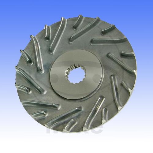 Die Riemenscheibe ist durchverzahnt und kann dadurch auf die Sternscheibe komplett verzichten. Zusätzlich sorgt die CNC gefertigte Lauffläche der Scheibe für eine saubere, vibrationsarme Keilriementätigkeit. Der Flankenwickel wurde angepasst und ermöglicht zusätzlich eine Geschwindigkeitssteigerung.
