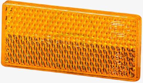 Hella Rückstrahler, selbstklebend für den waagerechten oder senkrechten Anbau Lichtscheibenfarbe: gelb Abmessungen (BxxHxT): 70 x 31,5 x 5 mm Wirksame Rückstrahlfläche: 18 cm² Prüfzeichen: E17 338 Kartoneinheit: 20