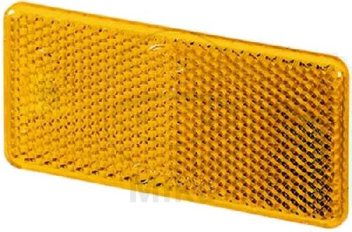 Hella Rückstrahler, selbstklebend für den waagerechten oder senkrechten Anbau Mit Kunststoff-Bodenplatte Lichtscheibenfarbe: gelb Abmessungen (BxHxT): 94 x 44 x 6,5 mm Wirksame Rückstrahlfläche: 29 cm² Prüfzeichen: E2 92031 Kartoneinheit: 20