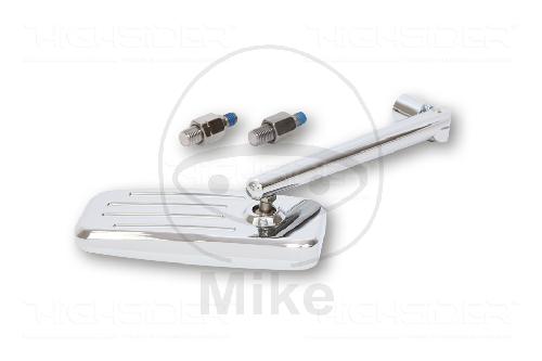 Hochwertig verarbeiteter, CNC-gefräster Spiegel in rechteckiger Form, verchromter Kopf aus Aluminium, mit verstellbarem Stiel. Dank der Verwendung eines zweiten Gelenks am Stiel ergeben sich zusätzliche Einstellmöglichkeiten für Ihre Sicherheit. Inklusive extra Adapter M10 x 1,25 mm mit Linksgewinde für Yamaha. für linke und rechte Seite verwendbar.