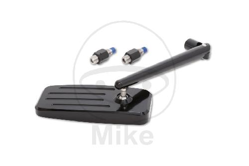 Hochwertig verarbeiteter, CNC-gefräster Spiegel in rechteckiger Form, schwarz-eloxierter Kopf aus Aluminium, mit verstellbarem Stiel. Dank der Verwendung eines zweiten Gelenks am Stiel ergeben sich zusätzliche Einstellmöglichkeiten für Ihre Sicherheit. Inklusive extra Adapter M10 x 1,25 mm mit Linksgewinde für Yamaha. für linke und rechte Seite verwendbar.