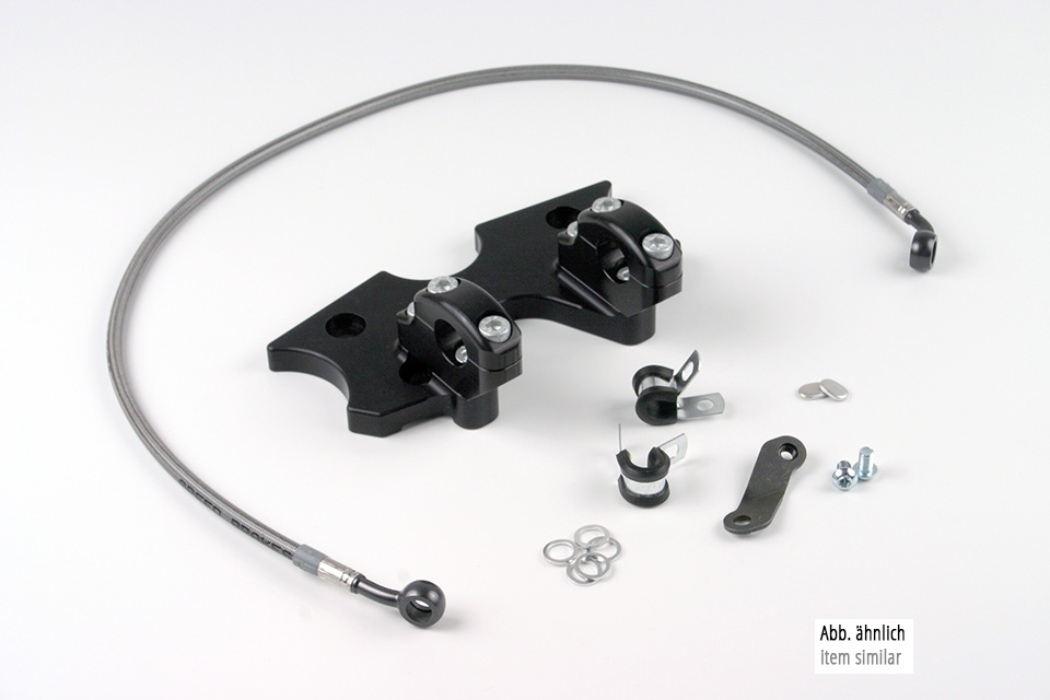 Superbike-Kit für 22,2mm Standard-Lenker<br>Die LSL-Superbike Umbaukits sind so entwickelt, dass sie mit einem vertretbaren Zeitaufwand und normaler Werkstattausrüstung auf dem Serienmotorrad montiert werden können. Je nach Modell werden die Kits mit einer kompletten Gabelbrücke oder einem ein- bzw. zweiteiligen Adapter und allen notwendigen Leitungen bzw. Zügen ausgeliefert. Die Teile sind je nach Farbe der Originalbrücke silber oder schwarz eloxiert.<br>Aufgrund der herstellerspezifisch unterschiedlichen Befestigung der Lenkerenden, können diese in der Regel nicht weiter verwendet werden, bitte prüfen Sie deren Verwendbarkeit und bestellen die gewünschten Lenkerenden dazu.<br>Die passenden Lenker sind nicht im Kit enthalten, sondern werden wegen der möglichen Material- und Farbauswahl separat dazu bestellt.<br>Bei einigen älteren Modellen kann das kürzen der Verkleidungsscheibe erforderlich sein. Wir bieten passend gekürzte Verkleidungsscheiben in Originalform oder mit Spoiler an. Dabei kann zwischen einer rauchgrauen oder schwarzen Scheibe gewählt werden. Für nähere Informationen nehmen Sie bitte Kontakt mit unserer Vertriebsabteilung auf.<br><br>Als Lenker empfehlen wir Lenker „SUPERBIKE FLAT“(22,2mm):<br>123LN01SW<br>123LN01CR<br>122AN01SW<br>122AN01SI<br>122AN01GO<br>122AN01RT<br>122AN01MB<br><br><br>Folgende Produkte passen zu diesem Artikel: Lenkergewichte 14mm bei Alu-Lenkern und 18mm bei Stahl-Lenkern / Bohrschablone<br>Wichtiger Hinweis zur Eintragung beim TÜV:<br>Sie benötigen unbedingt das mitgelieferte Superbikekit-Teilegutachten. In der Lenker-ABE sind nur Modelle gelistet, die original bereits einen Rohrlenker haben. Die Lenker-ABE ist zur Eintragung des Superbike-Kits nicht notwendig.<br>Lieferumfang:<br>Gabelbrücke<br>Bremsleitung/Bremsleitungen<br>Kupplungsltg./-zug<br><br>Hinweis:<br>Es muss weder die Scheibe, noch die Verkleidung gekürzt werden!