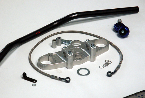 Superbike-Kit für 22,2mm Standard-Lenker<br>Die LSL-Superbike Umbaukits sind so entwickelt, dass sie mit einem vertretbaren Zeitaufwand und normaler Werkstattausrüstung auf dem Serienmotorrad montiert werden können. Je nach Modell werden die Kits mit einer kompletten Gabelbrücke oder einem ein- bzw. zweiteiligen Adapter und allen notwendigen Leitungen bzw. Zügen ausgeliefert. Die Teile sind je nach Farbe der Originalbrücke silber oder schwarz eloxiert.<br>Aufgrund der herstellerspezifisch unterschiedlichen Befestigung der Lenkerenden, können diese in der Regel nicht weiter verwendet werden, bitte prüfen Sie deren Verwendbarkeit und bestellen die gewünschten Lenkerenden dazu.<br>Die passenden Lenker sind nicht im Kit enthalten, sondern werden wegen der möglichen Material- und Farbauswahl separat dazu bestellt.<br>Bei einigen älteren Modellen kann das kürzen der Verkleidungsscheibe erforderlich sein. Wir bieten passend gekürzte Verkleidungsscheiben in Originalform oder mit Spoiler an. Dabei kann zwischen einer rauchgrauen oder schwarzen Scheibe gewählt werden. Für nähere Informationen nehmen Sie bitte Kontakt mit unserer Vertriebsabteilung auf.<br><br>Als Lenker empfehlen wir Lenker „SUPERBIKE FLAT“(22,2mm):<br>123LN01SW<br>123LN01CR<br>122AN01SW<br>122AN01SI<br>122AN01GO<br>122AN01RT<br>122AN01MB<br><br><br>Folgende Produkte passen zu diesem Artikel: Lenkergewichte 14mm bei Alu-Lenkern und 18mm bei Stahl-Lenkern / Bohrschablone<br>Wichtiger Hinweis zur Eintragung beim TÜV: <br>Sie benötigen unbedingt das mitgelieferte Superbikekit-Teilegutachten. In der Lenker-ABE sind nur Modelle gelistet, die original bereits einen Rohrlenker haben. Die Lenker-ABE ist zur Eintragung des Superbike-Kits nicht notwendig.<br><br>Lieferumfang:<br>Gabelbrücke<br>Gaszug/Gaszüge<br><br>Hinweis:<br>Es muss weder die Verkleidung, noch die Scheibe gekürzt werden<br><br>