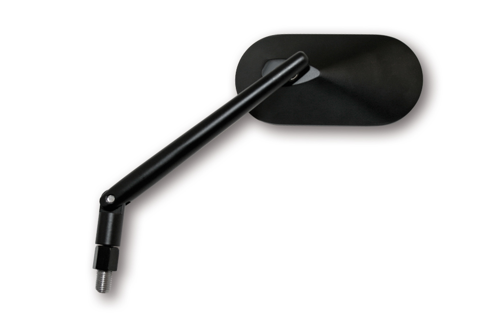 Classic shaped handlebar mirror with a chromed or black , oval alu head. Stem comes with a hinge for further adjustabilities and best view backwards. Fits for left- and right handlebar side. Inclusive one extra adapter with M10 x 1.25 mm L/H-thread for Yamaha.