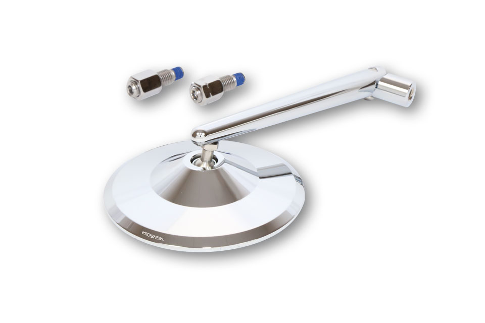 Shapely mirror with a round head made of chromed aluminium or black selectable and an adjustable stem for universal usage. By using a second hinge at the stem, more settings for best vision and safety are possible. Useable for left and right side, incl. one extra adapter M10 x 1.25 mm with L/Hand thread, e.g. Yamaha, E-mark.