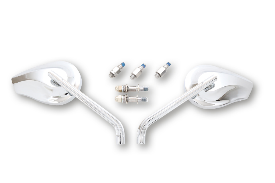 HIGHSIDER mirror PHOENIX 1, Alu chrome plated or black, for HD-motorcycles. Additional 2 mirror adapter M10 x 1.25 mm and 1 x extra L/H-thread adapter f. Yamaha, E-mark, pair.