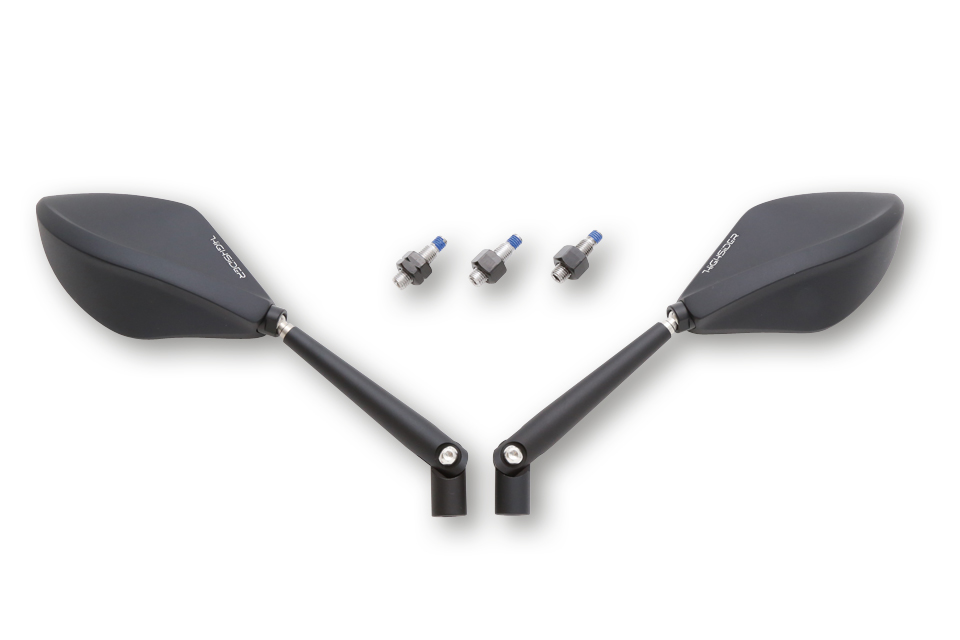 Universal handle bar mirror with a sporting arrow shape. This model comes in a black anodized housing. Inclusive one extra adapter M10 x 1.25 mm with L/Hand thread, e.g. Yamaha, E-marked.