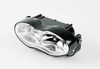 Oval double headlight with bracket and clear lens, E-marked.
