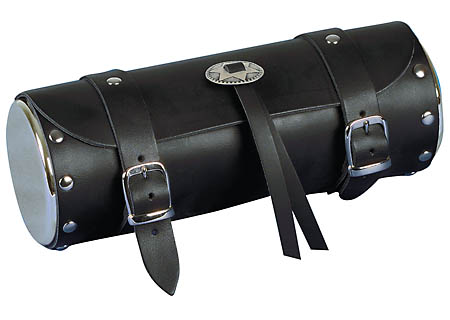 High quality cowhide tool box, round, diameter 9,5 cm, length 29 cm, with chromic lid and one concho